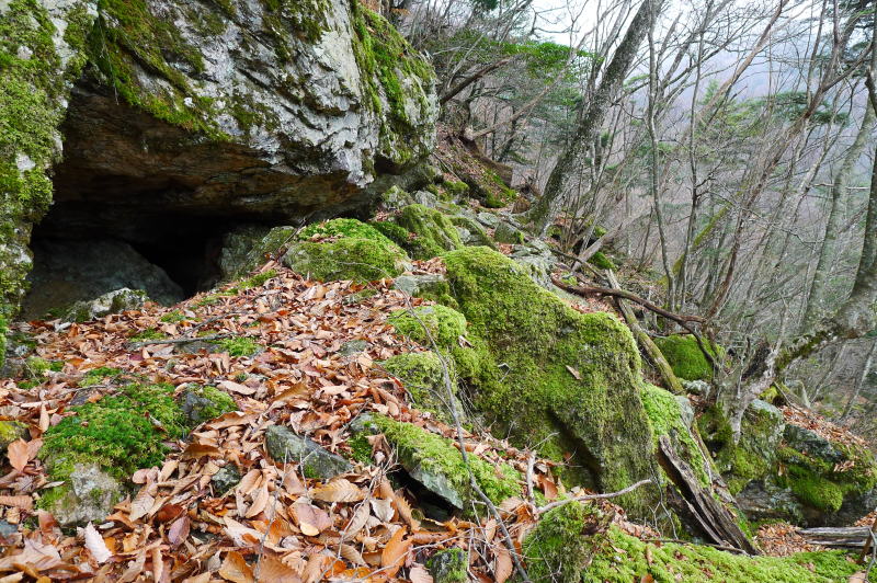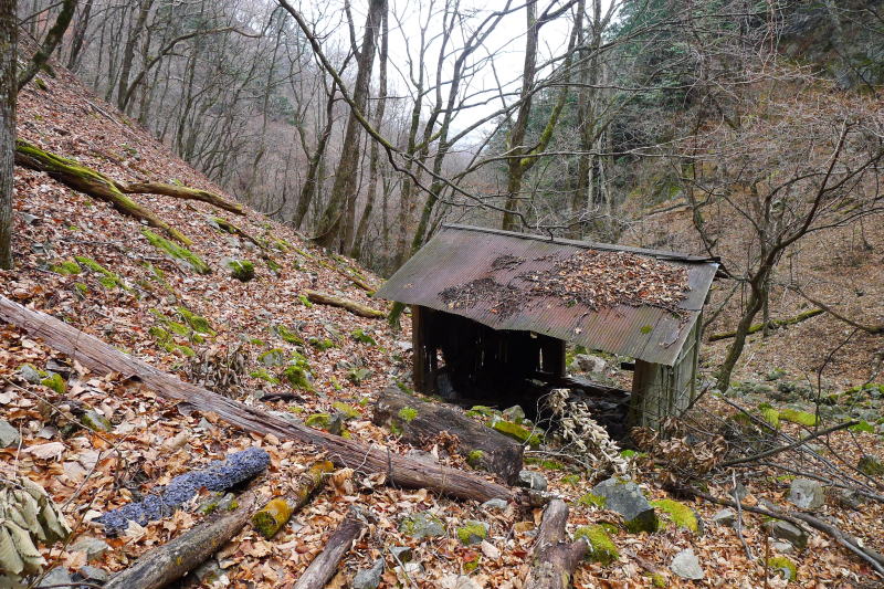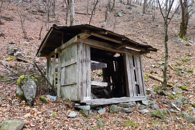 小川谷をしばらく登ると旧酉谷小屋です。ようやく耐えているもののもうすぐ朽ち果てるといった様子です。すぐ上の伏流水が湧き出た流れの傍にあって、かつては泊まりには最高の場所だったのでしょうが、東斜面の末端にあって、さらに巨樹に囲まれているので陽当たりはよくなさそうです。それでもこの小屋を使ったという記録も散見されるので、稜線の避難尾小屋まで届かない人には多少の安心を与えてくれる屋根がまだしっかりしているということだけでもめっけものでしょう。