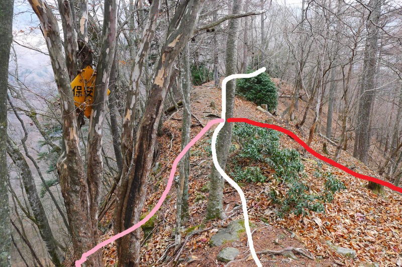 ピンク〜→上段歩道(急に踏み跡が薄くなる。急斜面)