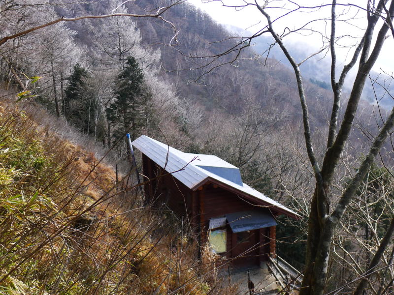 小屋の先で水の流れが無くなると、巨樹の間の道を辿ります。そのうちにカラマツと樫類の木が混生し、カラマツ主体になるまで登り詰めると道が右手にトラバースし、ようやく酉谷山避難小屋に到着です。この日はガスがかかっていたので小屋は見通せませんでしたが、晴れていれば直登の途中、樹林のすき間から右手に見ることができるのでほっとするところです。