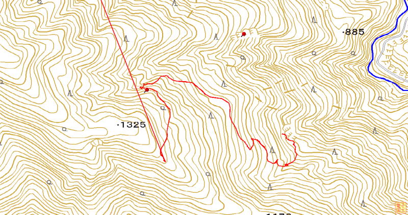 1325m手前の巡視道から上段歩道に約300m下り、崩壊斜面までのログを録った