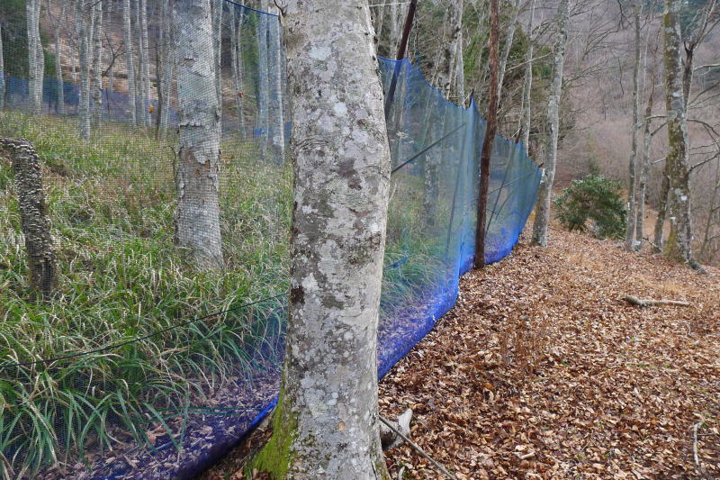 途中の山の中で面白い光景を見ることとなりました。今、秩父の山で禿げていないところ(草が生えているところ)は皆無といって過言ではありませんが、1か所、ネットで囲んで植生を保護しているところは、草が生い茂っています。これほど鹿の食害がひどいということですが、そういえば、今回、某所にイワウチワの植生があったのですが、個々の株はとても小さいのです。鹿が喰わないとすると踏み付けなどにより個体の矮小化を余儀なくされているのでしょう。「植生の保護のために指定地以外での幕営禁止」という御触れが稜線にあります。「排便排尿などによる山の環境の悪化」を理由とするのなら多少は理解できるのですが、それとても鹿の糞だらけの山では植生保護などという理屈も立たないでしょう。しかし、鹿の食欲は恐るべし!