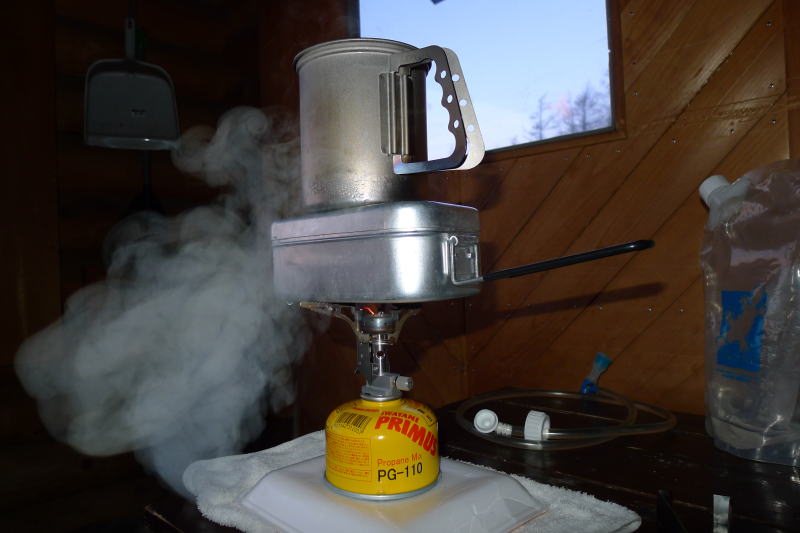 今朝目覚めたのは午前5時と早いと言えば早い。ごはんを作って、食べて、コーヒーを沸かして、片付けてもまだまだ出発までの時間が余っている。小屋の東側(トイレ側)に朝陽が当たっているのでひなたぼっこ。平和な時が静かに流れている。昨日あれだけこぼされていた土間の水は乾ききっている。小屋の窓を満開にして恒例の掃除を行って小屋を出発することにする。