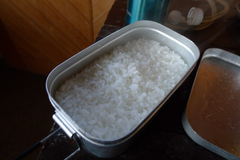 もう何度もメスティンでお米を炊いてきたので、コメを上手に炊くことにあまり問題はなくなっている。はじめは強火、湯気が出てきたら中火、沸騰したら蓋のすき間から水分がもれなくなる手前まで中火をキープ、焦げの匂いが仕掛ったらとろ火で湯気が出なくなる手前でコンロから下ろして蒸らせばOK!時計で時間を計ってなどという方法は面倒であり、そのような必要もない。