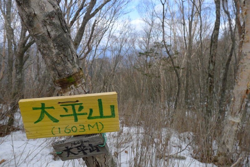 七跳山に登り呼吸の乱れも心の乱れも収まって、大平山へと向かう。雪がまだたっぷりと残っている大平山までは足跡はありないが、大平山から先には複数の足跡があり、ピークには新しい山名板が取り付けられている。大平山からしばらく下りると複数の新しい足跡が踵を返している。ここまででも結構きつかったのだろう。あとしばらくすると大ネド尾根分岐というところで男性が向かって歩いくる。昨日今日で初めて出合った人だ。