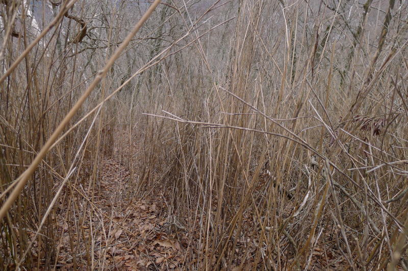 この群落地に稜線から下りると落ち葉を踏んだり枯れ枝を踏み折ったりと結構な音がする。しかし、先着の2人はその距離数メートルになっても顔を上げようともしない。それもそのはずでだ。これほど踏み込んでいる現場を見られたら腰を上げるのも恥ずかしいことだということだけは分かっているようだ。知らんふりを決め込んでいる。この落ち葉の斜面はフクジュソウの幼苗がたくさんあったところだ。でも、もうここが踏み込まれたので後から来る者が免罪符を得てどんどんと踏み込んでいってしまうだろう。自戒を込めて・・・「ネットの功罪ここにあり」