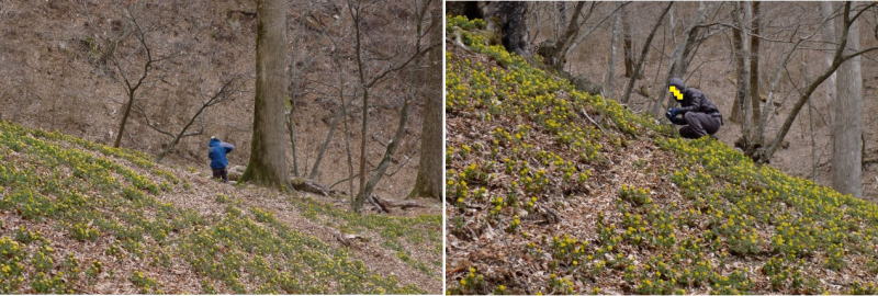 大ネド尾根からしばらく下って、例の降下点に着く。ここから急傾斜の藪を150mほど下ると件の場所にたどり着く(予定)だ。間もなくぼや〜っと黄色のしゅうたんが見えて来た。沢を登ってきたとみられる男性2人が夢中でフクジュソウにカメラを向けている。一見微笑ましい光景だが、足許は大変なことになっている。踏み荒らしがひどい。