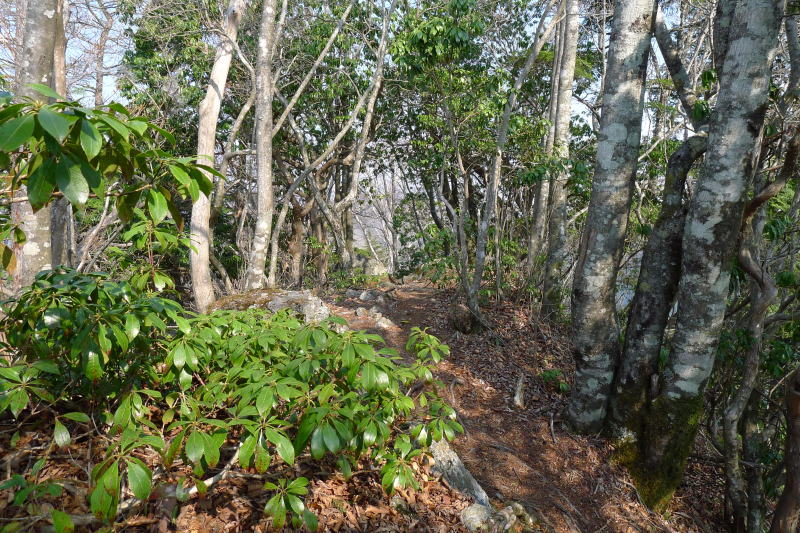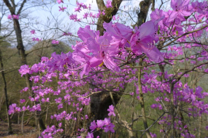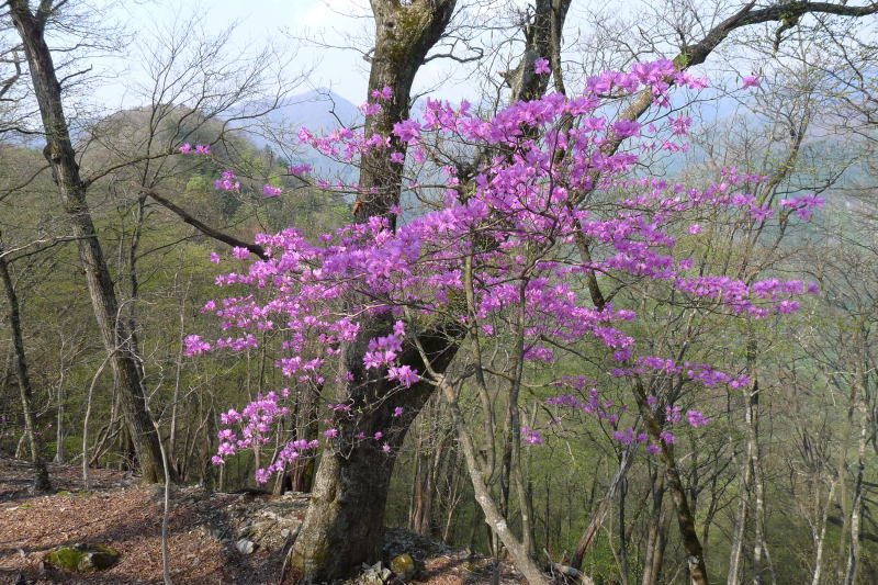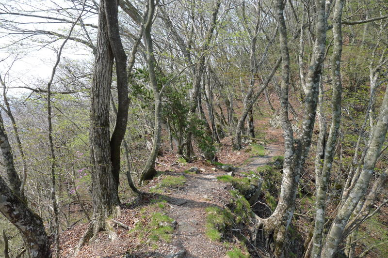 この周辺は気分のいい自然林で、わずかに芽吹いた新緑の中にミツバツツジが北斜面を覆っています。わずかに環境が違うだけでこれほどの差があるというのも不思議ですが、思ったとおりのミツバツツジの群落に出合えたことで嬉しさがいっぱいです。その先にもミツバツツジが続きます。次第に標高を下げて行くと、ミツバツツジの花は北斜面のあまり陽が届かないところに多くなっていきますので、そろそろスピードを上げて下りるようにします。