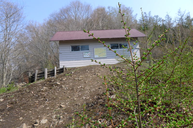一杯水避難小屋で休憩し着替えます。この小屋もとてもきれいに掃除されています。小屋の周辺にカラマツの幼苗が生えています。暖かい日差しを浴びたカラマツの芽吹きが優しく感じます。日曜日なのでスズ尾根から上がってくる人がいてもよさそうですが、ひっそりとしています。