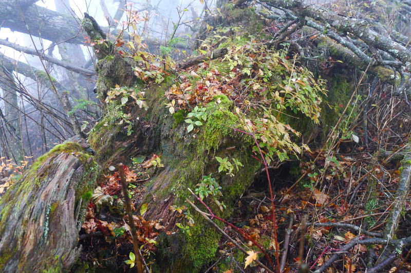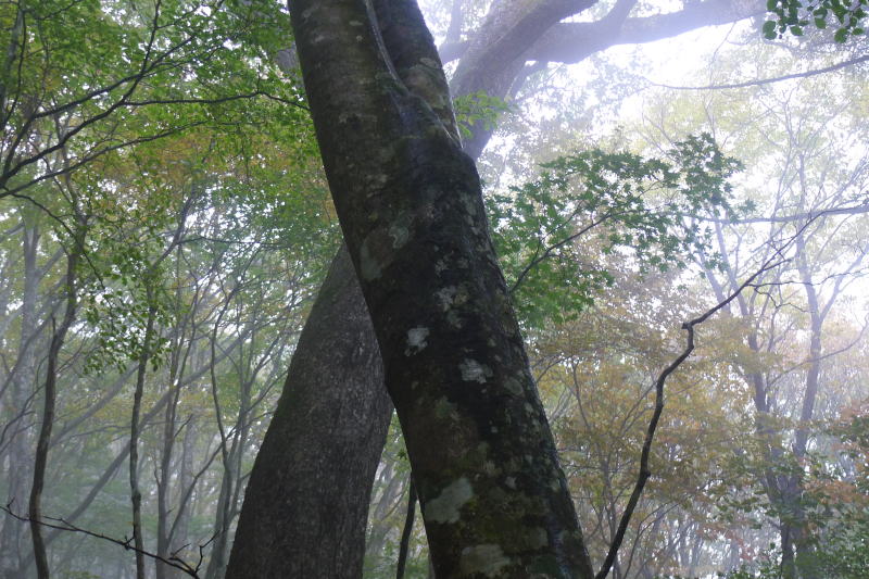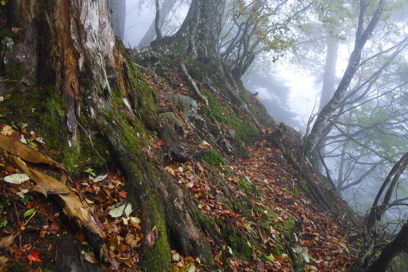 小黒からは稜線を辿ろうとしたが、すぐの急降下のところを行き過ぎてしまう。やはり小黒は気を抜くことができない。斜面を巻くようにしていったん戻ると古のトラバース道の下降点に着いたので、そこを行くことにした。道標を経て出たところは倒木をくぐってその先の稜線のブナの大木が1本あるところだった。
