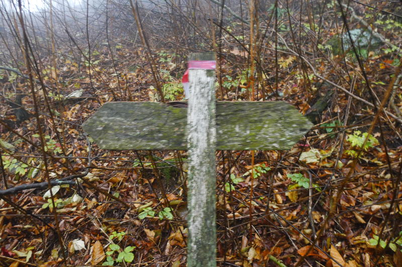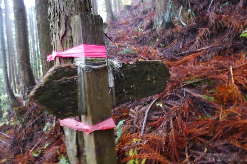 自然林の中をさらに下るともう一つの演習林の看板に出合う。この看板の後ろを行くように大きく左に曲がって下りる。(まっすぐ行きたくなるようなところではある。) しばらく自然林が続くが、標高を下げると植林帯となって、枯れ枝に埋もれた急な踏み跡を下ると、そのまままっすぐ進みたくなるようなところに、朽ち果てた道標が木に括りつけられている。
