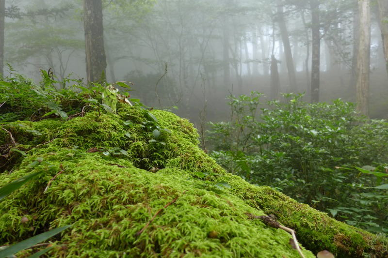 このご親切な夥しい赤テープを頼って、ウトウノ頭に向かう。出合う人もなく静かなピークで「ウトウ」に再会する。ウトウノ頭から大京ノクビレへと向かう。クビレの先は迷いようのないほどしっかりした踏み跡が出来上がって、その先のモノレールに出る。かの赤テープはここまでで、モノレールから先は、本来の好ましいタワ尾根歩きとなる。このころになってガスが立ち込めポツリポツリと落ちてくるようになる。途中までの酷暑とはお別れし、長沢背稜に出ると気温はグッと下がって快適になる。