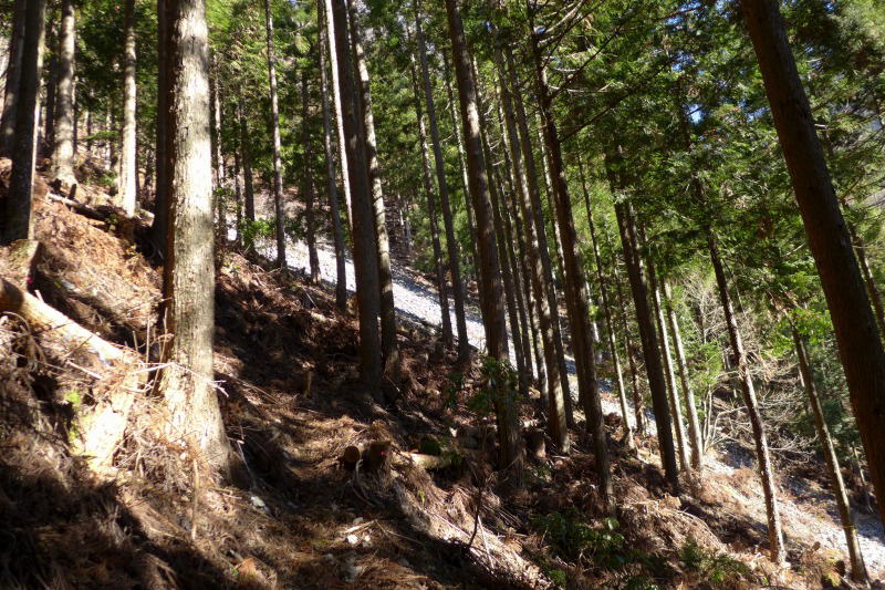 東谷林道が途中で工事中のためケンカ歩道に入り、好ましい渓相を眺めながらしばらく歩くと歩道は東谷林道に復する。クイナ沢橋へと進み崩壊斜面(小規模)からすぐさま尾根に取付く。いつもの急斜面をジグを切って淡々と登っていく。左手に大岩を見て陽がまったく射さず気が滅入るような植林地帯に入る。そのまま先に進むといつしか崩壊地点となる。前回、崩壊場所が危険だったので戻ってきたという人たちと会ったが、そのような気持ちにさせるところであるのかもしれない。さらに進むと、石灰岩質の岩石と思われるザレ場が、植林帯の先に見えてくる。このザレ場には進まないで付かず離れず斜面を登ると、休憩にちょうどいい平らなスペースに出る。ここには座るのに適した切り株もあって、いつも往復で腰を下ろすところである。