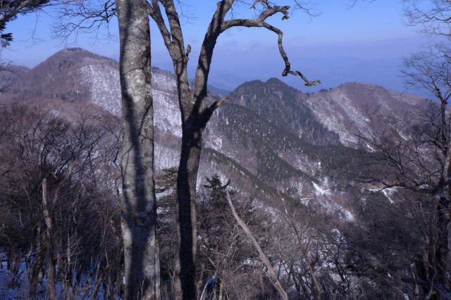 天祖山を下りると言う方も出立したので、そろそろ腰を上げなければとパッキングし、お世話になった小屋を後にする。長沢背稜に出ると太陽に温められた樹氷がダイヤモンドダストのようにキラキラと降り注いでくる。空気はとても冷たいが快晴無風で気持ちよく、ふわりふわりと言うように足が進む。しかしそれも束の間のこと。長沢背稜の登山道から離れて七跳山へと方向を変えると足跡はなく、深く積もった雪に加え傾斜がきつくなる。さらに七跳山から大平山への尾根には雪が深く積もっていて難渋する。