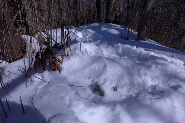 今年の特徴的なことは、過去にあれほどあったツキノワグマの足跡がまったくないことである。それほど寒く雪が深いからということだろうか。大平山の頂上でエネルギーを補給した後、バラモ尾根の分岐まで突き進む。ここでミネラルを補給しつつ坂を下るとそのうちにフクジュソウ群落地への下降点に着くはずだが、その分岐点に目印として付けておいた印はなくなっていて、もう一つの目印のコンクリート杭も見当たらない。少し進んで振り返ってみるとこの場所が分岐点であるはずだが、沢方向に少し下りてみてもピンとこない。そこで尾根の雪を登山靴でかき分けながら探るとアイゼンがコンクリート標識をガリッととらえる。