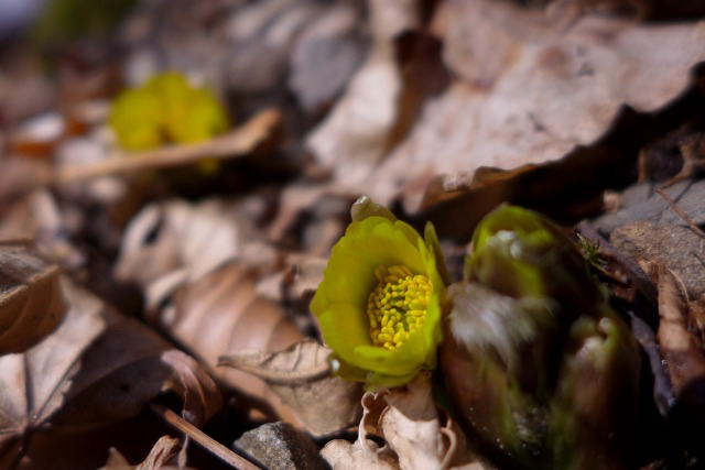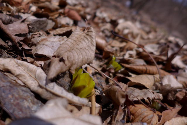 実は、北海道の日高地方に2月に入ると、どんなに極寒の日が続いても、どんな吹雪にまみれようがフクジュソウが咲く場所がある。ここ秩父の山中も同じで、日高の山のフクジュソウと同じような環境の場所があって、間違って咲いているのがあるだろうとの目論見があってのことだった。(2005年3月5日の日高の山のフクジュソウ)