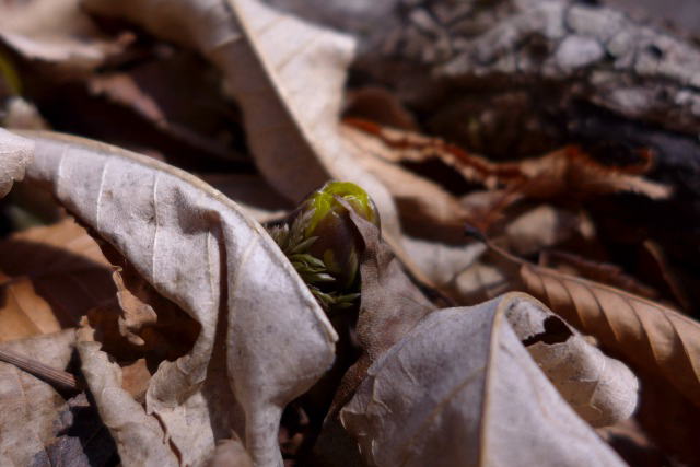 やはりここが下降点だとの確信を得て、転げ落ちるような急斜面を20分ほど下りる。そこは、最盛期には黄色い絨毯となるところだが、一面雪に埋もれていて、フクジュソウの芽でさえも望むべくもない状況である。しかし、何度も通った勝手知ったる沢なので、こんな状況でもフクジュソウが芽を出しあわよくば開花株が見られるであろう場所へと移動する。すると芽を出した株が一つ、そして少し移動して開花株が2株・・・。がんばってここまで来て本当に良かった。