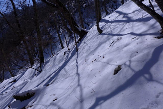 さあ、これから700m下らなければならない。沢筋に溜まった深い雪を漕ぎながら下りるが、どこに岩があってどこに足を取られる穴があるかも分からず、せめて骨折だけはしないようにと注意しながら、ときに股下までの雪と格闘する。これまでがもう少し暖かければ両サイドの斜面の雪が滑り落ち切って危険は少ないのだろうが、今年は斜面の雪がまだ雪崩れておらず、いつ巻き込まれるか分からない。(この時期のフクジュソウ見物は自己責任が大前提である。)