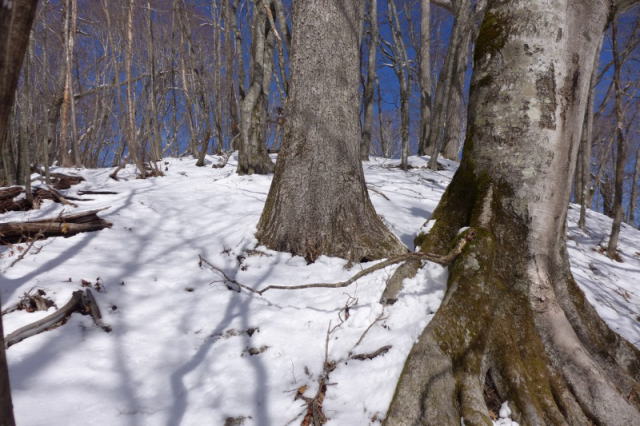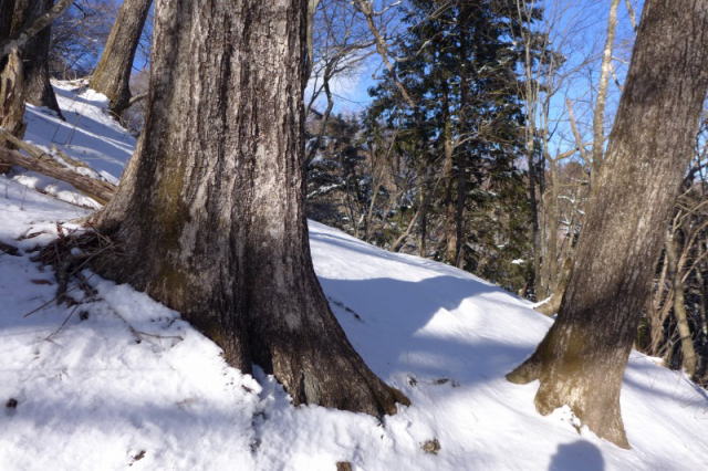 それでも陽が射しこむ南斜面の雪は少し溶けかかっている。ただ、それも金袋山までのことで、あれほど雪のあった前回でも大樹の周りは輻射熱で雪が解けていたのに、今回のは降って間もないことからそのような現象はどこにもない。それでも、夏道を探りながら行きわずかな踏み跡に乗ると少し楽をすることができる。