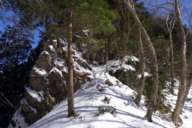 奥多摩駅から東日原に車を進め、ねねんぼうの看板があった駐車場から一石神社へと歩く。平日登山、誰にも会わず神社からの急斜面に取り付く。前回(1/25)と違ってすぐ雪が現れるし踏み跡もない。ということは、2/5に降った今回の雪は相当手強いということか。