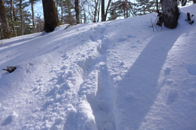 もうひとつ、前回と違うことは斜面の新雪の下はカチンカチンに凍っているということ。すなわち急斜面のトラバースで木の根に乗ってしまったり、氷に足を取られちょっと滑ると、とんでもないことになるということ。ウトウの頭までは良かったが、その先の急斜面にも雪がびっしりと付いていて足下が確認できず大スベリ、大京のコルに向かう左側の急斜面ではうっかり足を取られ転倒してしまった。ということで本当はアイゼンの着用が望ましい。