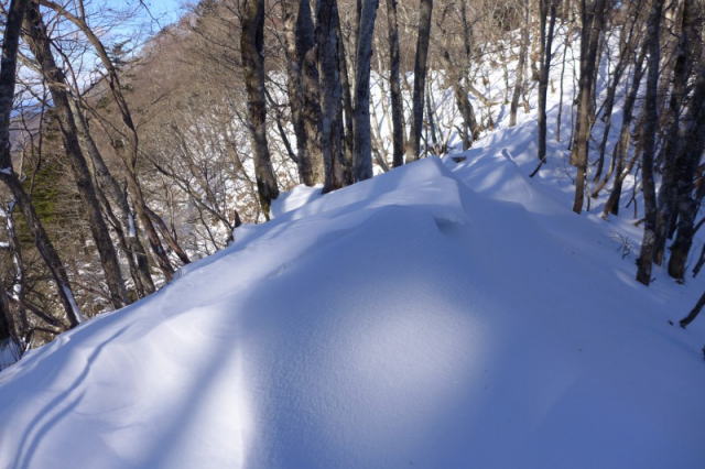 長沢背稜は雪がたんまりと積もっていて、今回も辛い雪漕ぎを強いられるなぁと思っていたが、夏道を見つけながら行くと降り積もった雪がわずかに凹んでいるところもあって、それに乗ると歩きやすい。最近の記録を見ると一人が酉谷山から天祖山を歩いている。ところが、長沢背稜で見つけた凹みは稜線に上がろうとしてその先が消失している。ということは、この足跡は酉谷山方面への通行をあきらめたものなので、この先は前回の自分の足跡を中心に辿ることになった。