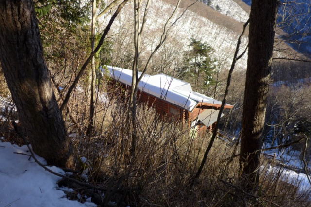 今回は、一石神社からの急登が辛くベンチまで10分も余分に要してしまった。また、長沢背稜から酉谷山方面で向かう途中で脚の付け根(蝶番)が疲れてきたが、それ以外はスタミナ切れもなく気力も旺盛だった。大きな休憩と言えばベンチで5分、金袋山での腹ごしらえ10分、長沢背稜でのストレッチ等10分のみ。勇躍臨んだ長沢背稜は雪に覆われ、あるいは滑りやすく細い足下で緊張が必要なところもあったが、夕陽に染められた小屋に到着する。小屋の外の寒暖計は−11℃を指している。小屋の前は雪が少し吹き溜まっていて、戸を開けると・・・、この寒気で小屋内部全体がすっかり冷凍され、その後体は厳しい寒さに震えあがらざるを得なかった。