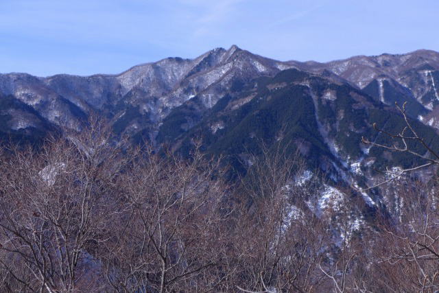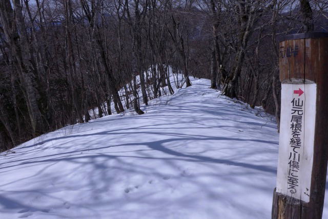 仙元尾根の雪は、予想していたより少なかったが、それでも仙元峠手前の大きなコブから下って鞍部、そして仙元峠がもう少しというところまでは深い雪に覆われている。それでも、ほとんど休憩を入れないで峠まで約4時間で登り切ってしまった。ところどころに残っていた踏み跡は、蕎麦粒山方向から延びてきており、一杯水方向への稜線に足跡は一つもなかった。蕎麦粒山からの稜線の下に付けられた登山道に合わさると、一杯水方向からの真新しい踏み跡が2人分あって、吹き溜まりを通過するのに楽をさせてもらう。