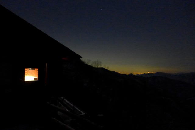 持ち合わせのアルコールが切れ焼酎をいただいたりしているうちに夜の帳もすっかり下りた。先着の方は明日は夜明け前の出立ということで眠りに就いたので、外で夜景を眺めながら夜風(マイナス9℃)に当たる。プリムスのマイクロランタンを灯した小屋はあかあかとしている。最近は、徹底してザックの軽量化を図っているが、冷たい感じのするLEDの灯りだけでは落ち着かないので、ぬくもりのある灯りが欲しくてガスカートリッジとともに持ってくることにしている。これ二つで約600gが余計になるが、厳冬の山で湯たんぽとともに欠かせない。2人ともかすかな寝息を立てている。湯たんぽ入りのシュラフに潜り込むと瞬く間に意識がなくなったようだ。