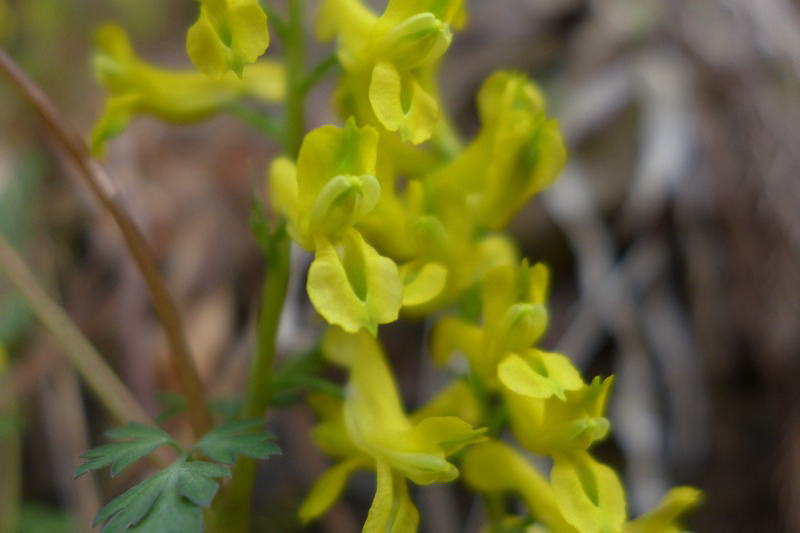 1日目の予報より2日目の方がいいからと、大ドッケのフクジュソウ群落地は後回しにすることとし、途中、道路脇の花を愛でつつ浦山大日堂に着く。平日とあってこの時期だけ特有の喧騒はなく、ゆっくりと身支度を整え浦山大日堂から仙元尾根の急斜面に取り付く。すでに道に雪は残ってはいないが、石突は氷の感触を得る。