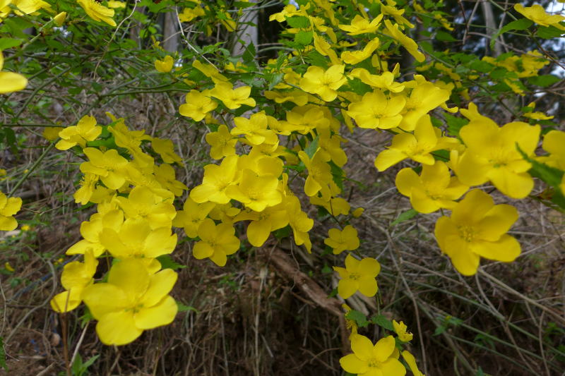 集落の途中にニリンソウ群生地の看板が立っていたり、実際ニリンソウが斜面を覆っていたりするし、庭にあると言うことはあってもサクラソウが咲き、ヤマブキが林縁に咲き、いつもの場所にエンレイソウが咲き・・・、と無聊な林道歩きも楽しい。