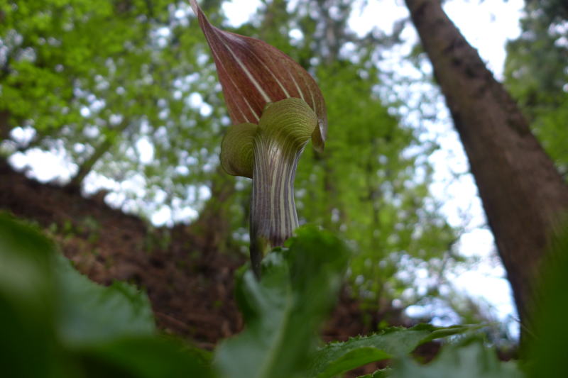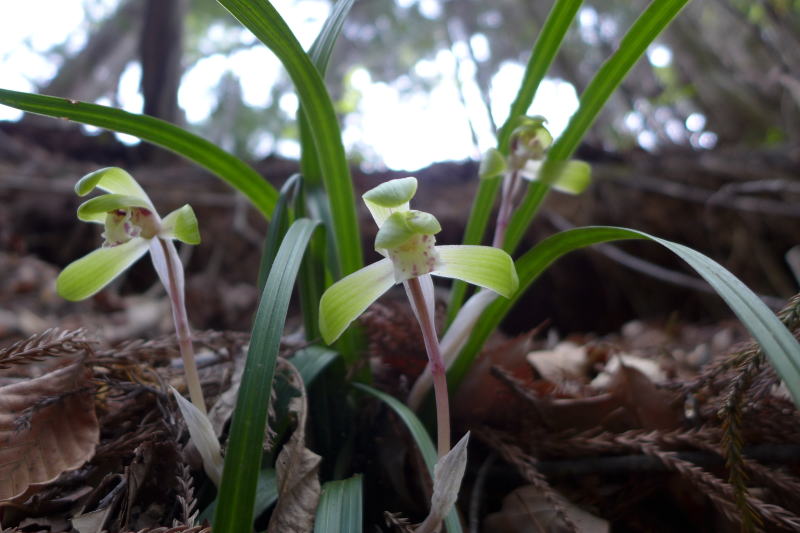 昔は雑草のごとく咲いていたであろうシュンランも、今では見るのもその目的も持って歩かないとお目にかかれないが、駅から酉谷山までの間でどこに植生があるのだろうかと注意を払ったが、今回見かけたシュンランはたった1か所、それも数株だけであった。しかし、数は少ないものの、シュンランは待ってくれていたようにちょうど咲いたばかりのご様子、楚々とした姿が美しい。
