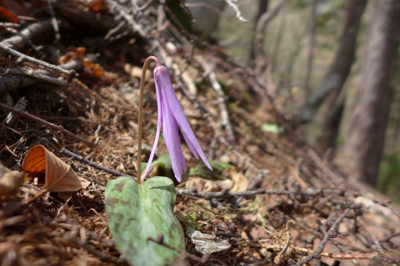 今は、ブームになるとそこに人が集中してほかのところに目をくれないような様相を呈するので、そのおかげでこのようなマイナーなルートに平和が保たれているが、その平和の中身と言うとイワウチワやカタクリが細々ながら尾根を彩っているのである。今年の踏み跡のない尾根で、今年も咲きかけのカタクリや開花したばかりのイワウチワに出合うと、幸せ感たっぷりなのである。