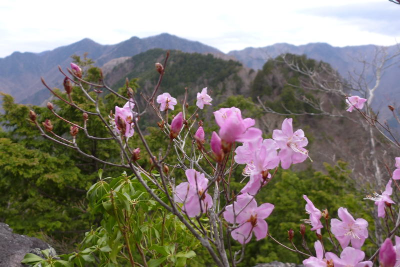 イワウチワとミツバツツジが咲く祠から上で注意すべきか所は熊倉山からの尾根に出る手前の大岩の巻き道であるが、その巻き道と間違って林業作業用の踏み跡を一つ手前のコブで巻いてしまい、一度大きく軌道修正を迫られた。軌道修正が済むとこの巻き道にはテープが適切に付けられていて、大岩の主稜線側の鞍部に出る。そこからの急斜面を登り詰めると、アカヤシオツツジが咲く岩場の稜線を歩き、その先でシャクナゲの群生を見た後、誤進入を戒める虎ロープが張られたところに出る。