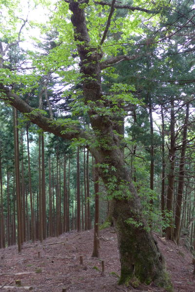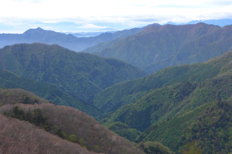 今日のこれからの目的は、滝入ノ峰手前の尾根から倉沢の廃村への踏み跡を辿ることである。ここから先は未踏のところで、かつ、下りに使うこともあって丁寧にGPSに情報を落としてきた。最初は稀に見る自然林で新緑に包まれて幸先がよさそうだったというのもちょっとの間で、尾根を外すと踏み跡を認めるのは非情に困難だった。いつも同じところを同じように歩いて緊張感も新鮮味も失せていたので、あ〜山を歩いているなという気持ちにさせられ、GPSに落としたコースを見付けようとしてもなかなか見つからず、知らず知らずのうちに(冷)汗を流すようになった。