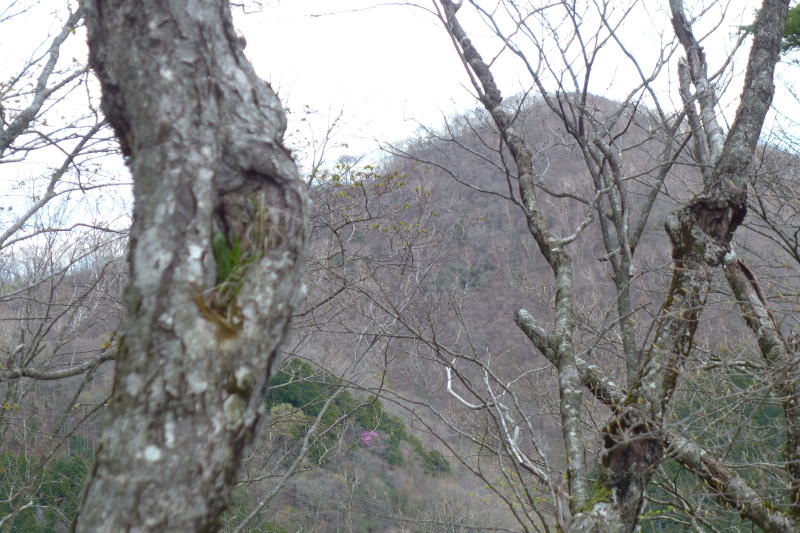 小屋からの登山道脇にはミツバツツジの木を多く見かけるがどれもまだ蕾は固く咲いているものはない。先に進んだ背稜の南面の急斜面下部にどうにかアカヤシオが咲いているのを見るが、それは陽当たりのいいところだけであり、まだまだ咲くのに早い。大栗山手前の鞍部から見る大平山南斜面もうっすらとピンク色が霞んで見えるようであり見えないようであって判断が難しい。ただ、一か所ミツバツツジの巨木が満開の花を付けているところがあった。