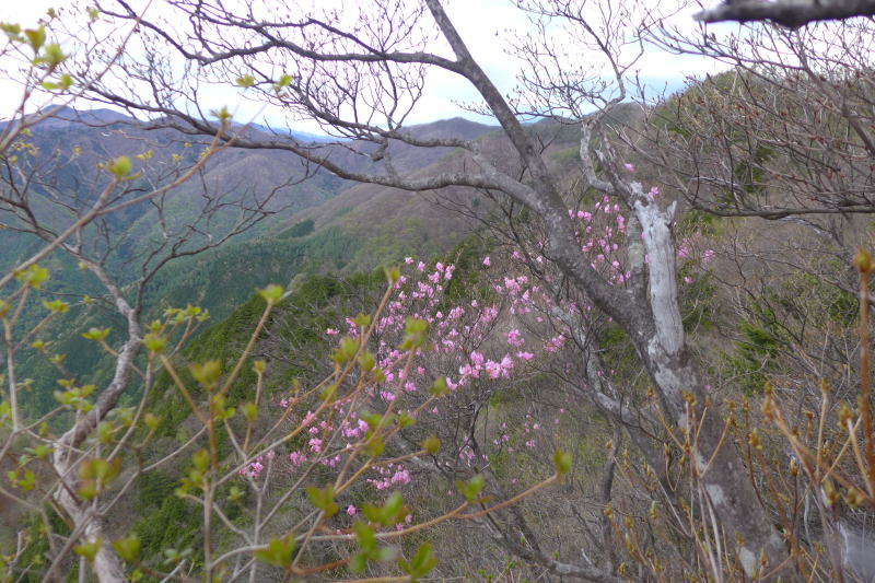 大栗山の先にもアカヤシオがポツポツと咲いていて、ハナド岩に来ると崖の下でアカヤシオの花が盛りだったのでもしかして、と天目山(三ッドッケ)を回って行くことにした。三ツドッケの頂上は、篤志家?によって視界を遮る木々が切り倒されたためよい展望を得られる。その罪を一身に背負ってこのことを成したことに対する賛否はそれぞれあろうが、植林ばかりのこの界隈では得難い場所になっている。