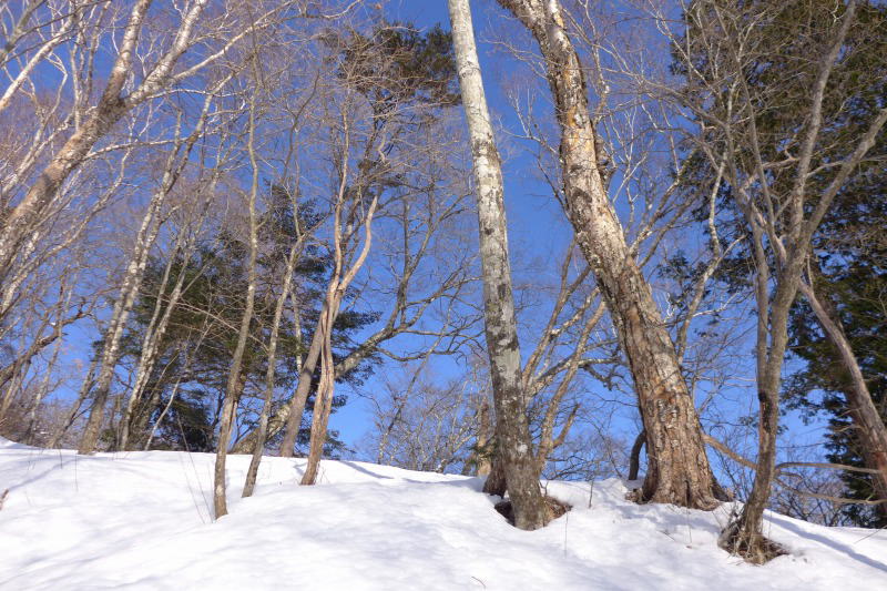 昨日から誰にも会っていない。タワ尾根をしばらく下る。ようやく、篶坂ノ丸というところで単独氏が登ってくる。「泊まりですか。」という問いかけに、表情筋をまったく変えることなく「泊まりです。」と答えて過ぎ去る。その足跡は篶坂ノ丸をオロセ尾根から上がってきていた。なかなか「通」な人だなと思ったのは思い違いであることが分かった。この氏の足跡は一石山方向からあって、金袋山手前の水源巡視道をいったん孫惣谷方向へ迷い込んで、その後篶坂ノ丸へ上がって行ったものであった。