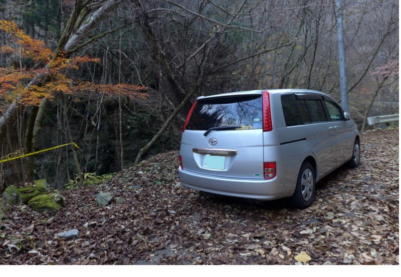 大血川渓流観光釣場上流の駐車地点に戻ると、前日停まっていた車がない。あれれ、おかしいなと思っていたら大黒尾根を下りてこられたらしい。窓にメモが張られていて、ことの真相を伝えてくれている。水場のことはそうだったのか。