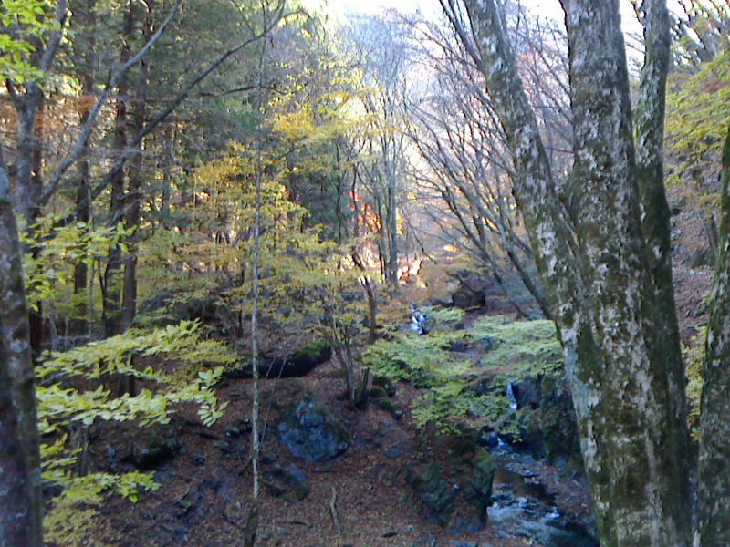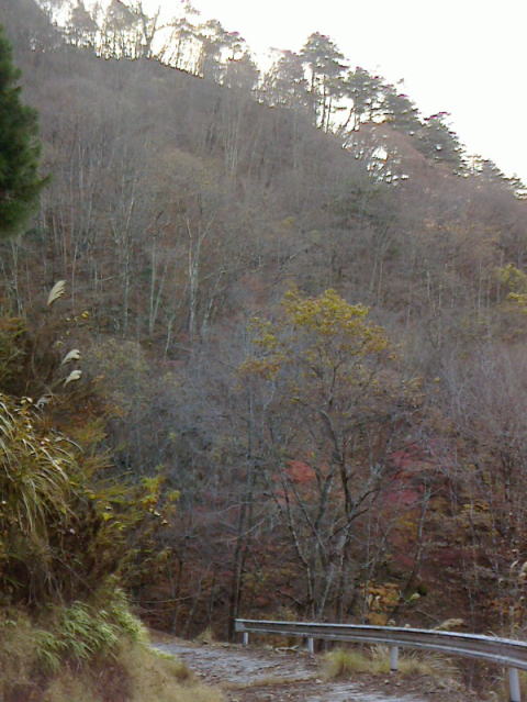 大血川渓流観光釣場には駐車場があるが、山に登るものには使わせてくれないので、林道をさらに太陽寺方面に向けて車を進める。いつものスペースに車が一台停まっているので、その後ろにつける。あ〜、欲しかったいい車だなぁ。山に登っているだろうな、この人も、と考えながら東谷林道のゲートをくぐる。東谷はまだ紅葉が残っており、綺麗だ。惜しむらくはカメラにSDカードを入れ忘れてきたことだ。(ということでカメラの内臓メモリーを無駄にしないために道中の景色は携帯で撮ったもの。)