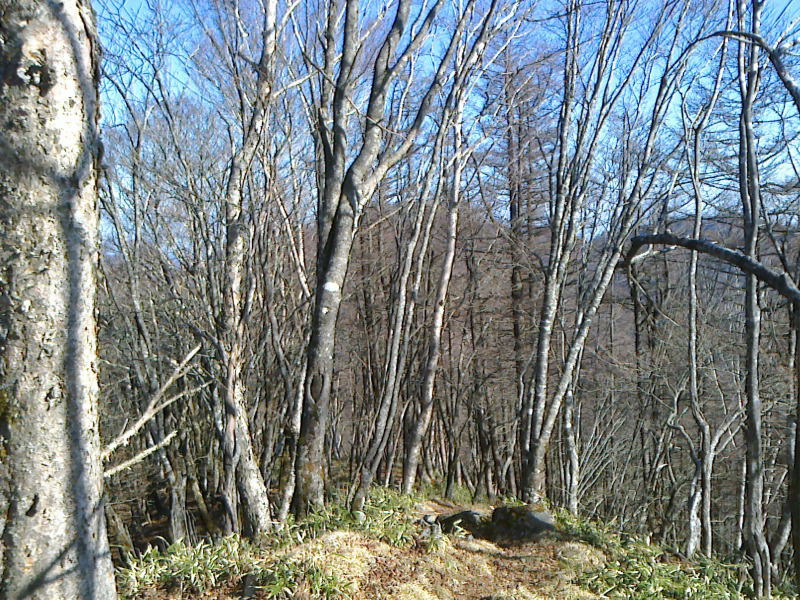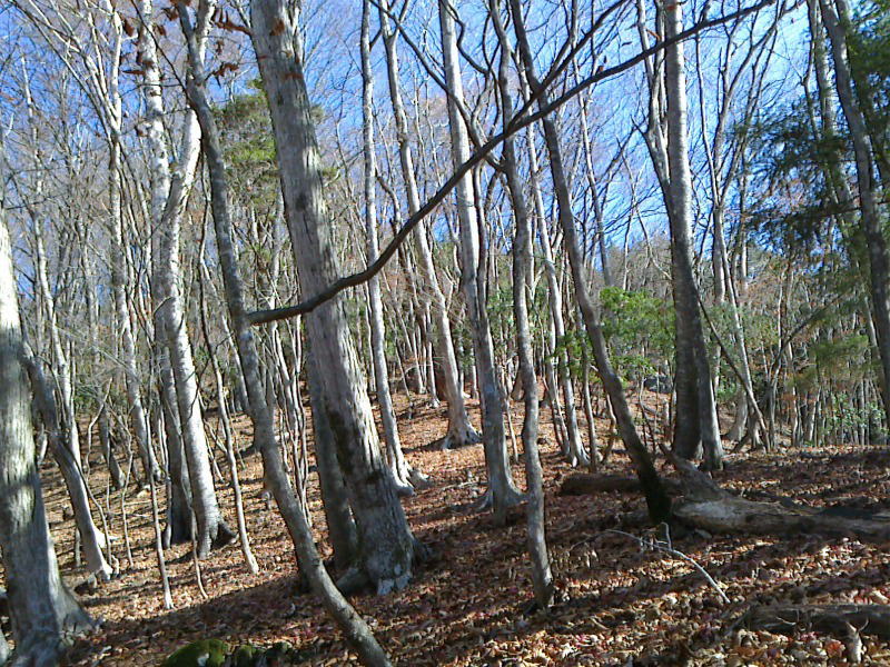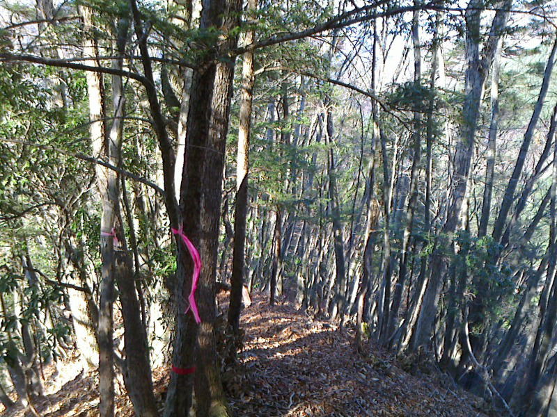 クイナ沢橋から尾根に取り付いて広葉樹林の中を登り、大岩の右手をトラバースして鬱蒼とした植林地に入る。植林地帯をしばらく登ると道に切った木を渡してあるところをそのまま進むと、ロープがフィックスされている崩壊地になる。今日は、その木の桟道の手前で道なき斜面を攀じ登ることにする。というのも、ここを通ると明るい広葉樹林の中を登ることができるからなのだった。踏み跡はないに等しいというよりないと言っていいのだが、要所に赤テープが付けられているから、それを漠然と追って行けば尾根筋に出るので、次は尾根筋をどこまでも辿ることになる。そうすると、本来の山道に出るので顔を右に向けると東大演習林の丸い看板がある。