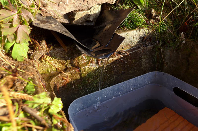 小屋に着いてみると、水場がとんでもないことになっている。後で知るがそれでもある程度別な人が修復してくれたものだったが、今までの小屋の水場の様子からすると破壊的で絶望的な姿を晒している。ゴムシート2枚は表に放置されている。水場の表土は前々回10/1に訪れたときには削り取られ、石が掘り起こされていた。また10/30に訪れた際もゴムシートの先端だけはいじられていなかったので流れは十分あった。しかし、コンクリート枡の周縁に水が回っているようでは、水がすべてゴムシートに収斂されておらず、渇水時は困りものだと危惧していた。水場にはコッフェルが置かれている。酉谷山からの下りで会った3人のグループのものだろう。水を貯めようとしているが、半分も溜まっていない。ということはどれほどの時間がかかってこの程度なのか。先が思いやられる。取り敢えず時間をかけてでも水を確保しなければならない。それは、小屋の収容人数+αの人がそろうまでだ。
