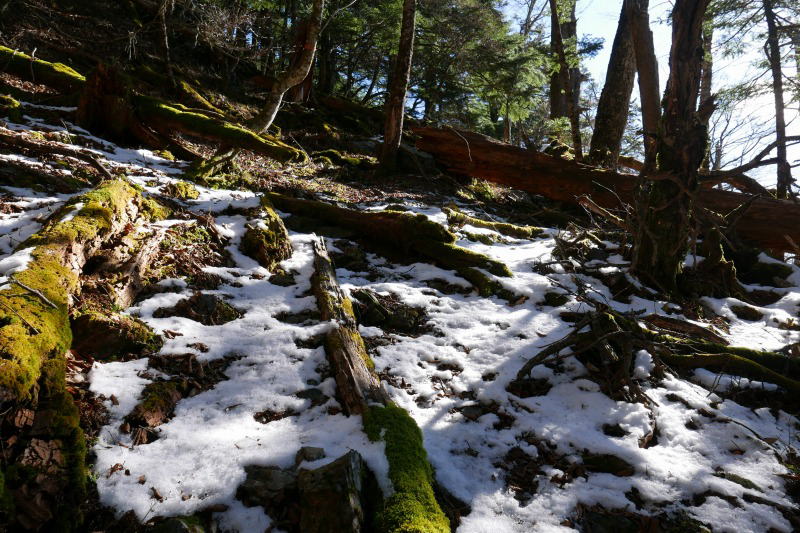 心地よい陽が射し込むブナ林を抜け、崩落地を避けて急斜面を下りてから元に復し、ロープが張られている急斜面を下りようとしたら、下から人が単独氏が上がってくる。少し話をして別れるが、4人組とは違って人を見るのに冷たさのない、山で出会ってホッとさせてくれる感じの人だった。