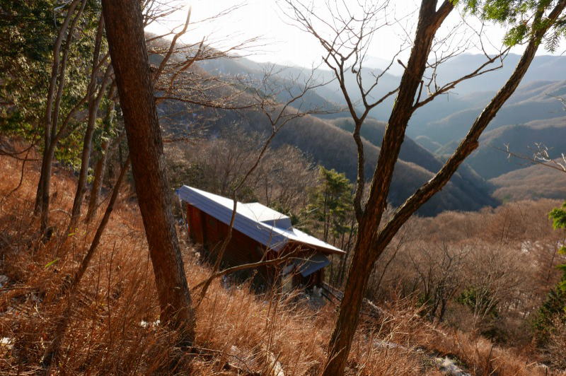 小屋が見えた。長沢背稜から小屋に向かって下りると、小屋の外に男性2人がいる。あ〜、このシチュエーションは吉祥を意味するものではない。小屋の戸を開けると、それぞれ単独の男性が板の間に場所を得ている。つまり、酉谷山に登って行った人を加えると、4人ではなくすでに5名様が小屋の人となっていたのだった。酉谷山に登っていた人は奥に陣取り、その手前に結構年配の男性が少し間を開けてエアーマットを敷いて境界線を設けていた。