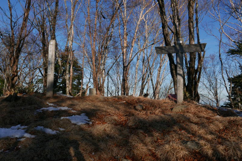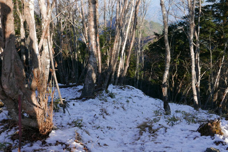 大血川と熊倉山を分ける分岐にどうにか出ると、北斜面に雪が残っている。前回、小黒への登路にあった、ビロ〜ンとだらしなく垂らして括りつけられていた赤テープがきれいに取り去られ、打ち捨てられている。これが醜いものだと思う同じ感性の人がいたのだとうれしく思ったが、征伐したテープを持ち去っていただけていれば、好感度はグゥ〜ンとアップしていたのに惜しい。