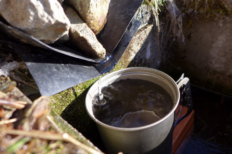 昨日のうちに決めていたように、2日目の今日は計画を変えタワ尾根を下りるだけなので、日が昇ってからのんびりと起きることにする。起きてから、まずはコーヒーを一杯。その後水場の流れを見て水を得てから食事。身の回りを整理してから小屋の清掃を行うと、夜明け前には起きていたのに瞬く間に時が過ぎてしまう。