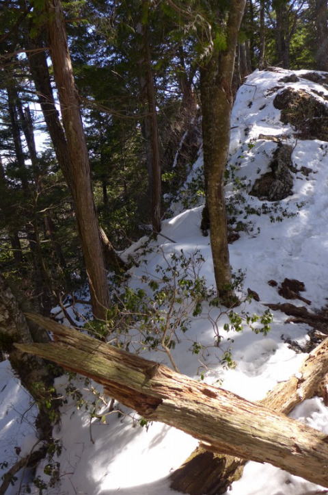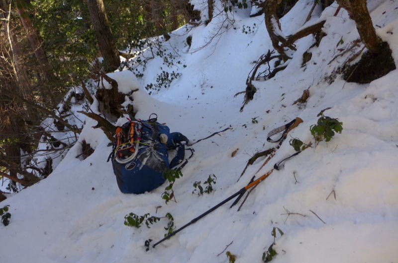 これが間違いのもとで、岩場の狭い足場で足をそろえたとき、足枷を嵌められたように爪を引っかけてしまい、こけしが倒れるように岩場から斜面に倒れ落ちてしまった。一瞬のことで何もできなかった。顔面から雪の中にうっぷしてしまったが、かすり傷を負っただけだった。バックルを外してザックを斜面から滑らせて体を自由にし、自分もザックが止まったところまで斜面を滑り落ちる。