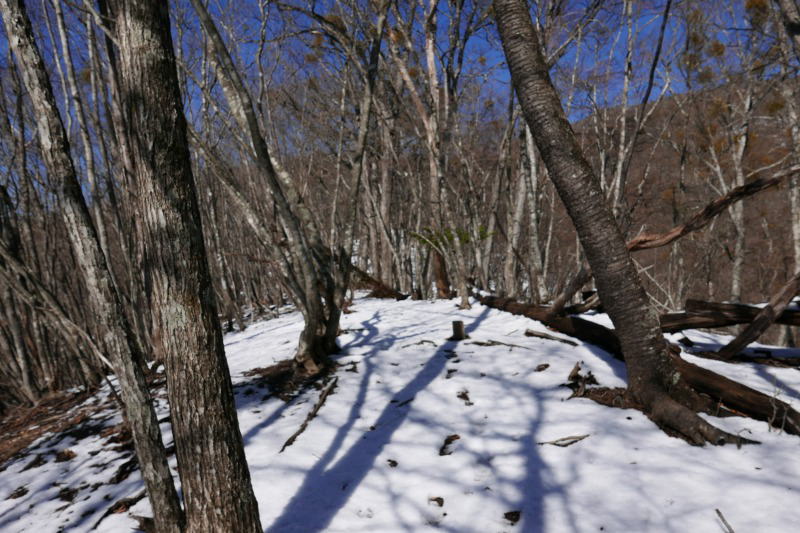 大京ノクビレに降りると、雪が本格的に積もっている。ここから先はもうトレースが全くないので、自力で進むしかない。結果的にクビレからは約1時間半を要して長沢背稜に合流する。長沢背稜にもまったくトレースがない。この様子だと頑張って2時間という目標を自分に課して黙々とラッセルを続ける。日当たりがよくて斜面からの崩れがないところは10〜15センチの深さだが、南斜面でも日当たりの悪いところや雪崩っぽい積雪のあるところは膝上までの雪が積もっている。ほぼ2時間、ラッセルにラッセルを重ねて、ようやく酉谷山避難小屋が見えてくる。酉谷山への尾根の道を通らずに来たが、カラマツの林のところの積雪は酉谷山避難小屋への分岐点まで、うんざりするほどだった。しかし、小屋が見えればすべての苦労が忘れられる。水場も健在だ。もちろん小屋は貸し切りである。3月3日に宿泊された人のノートの記述を見ると、丁寧に小屋を掃除されて帰られたことが感じられる。しかし、その後に泊まったであろう人がいたはずだ。この小屋を利用する際のスタンダードからは少し外れてしまったのかなぁという印象を持つ。