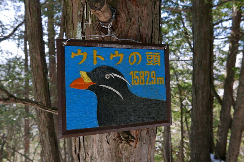 東日原の街並みを過ぎると、車窓から見る山には雪がしっかりと見える。こんなに雪が多いのかと驚かされるが、行かねばならない。一石神社からベンチまでには雪がなく、ロングのTシャツと半袖のTシャツの重ね着だけでも汗が噴き出す。ベンチに着いたときは背中が汗をかいている。ベンチから金袋山のミズナラの巨樹までの間で雪が出てきて、巨樹から先は次第に雪が深くなってくる。雪質は柔らかく水分を含んでいる。1〜2日前に付けられたと思われる往復の足跡が1人分ある。登りではワカンを使い、下りでは6本歯のアイゼンを使っている。そのトレースを追って登っていく。この人のトレースはおおむね夏道をほぼ正確に取っていると言っていい。ただ、この尾根を何度も登った人かと言うと、そうでもなさそうだ。