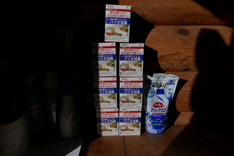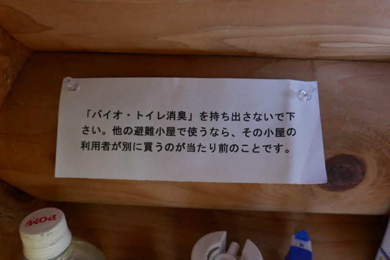 ある年に私が酉谷山避難小屋に持ち込んだ汲み取り トイレバイオ消臭6箱の大半がなくなっていたが、それが一杯水避難小屋に持ち込まれた模様であった。このほか、今年も4箱あった未開封のトイレバイオ消臭のうち2箱が忽然と姿を消したので一杯水避難小屋を見ると、2箱が置かれていて一杯水避難小屋への水平移動の疑いが持たれるのであった。