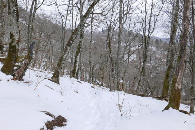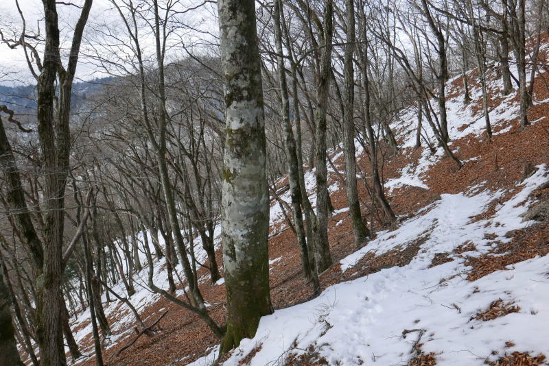 29日に付けられたトレースは尾根に出て酉谷山に向かっている(ことを分かっていた)が、敢えて巻道を進む。雪はそれほど深くはなく登山道に鹿たちの足跡があったので、これを利用して進む。途中吹き溜まりが2か所ほどあったが、難儀するほどではない。そのトレースは、いったん嘉右衛門尾根に入り込んで戻ってきている。この先には、年配の遭難者が未だ見つからず眠っているはずだ。